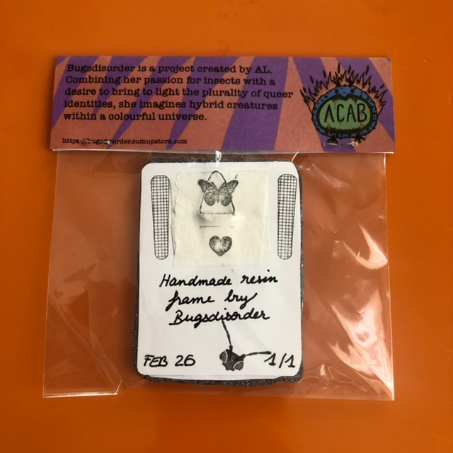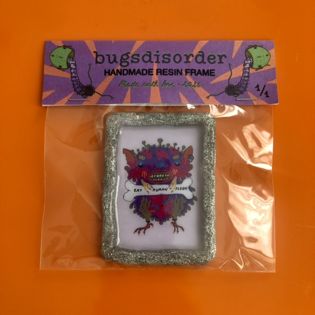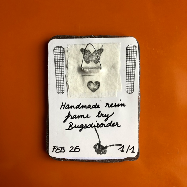 The frame is made in resin and glitter, the background is in hard paper with a hook to put it on a wall and a clear resin glazing on the top of the drawing.