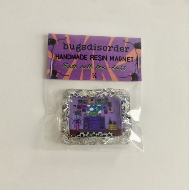 The frame is made in resin and glitter, the background is in hard paper with 3 tiny magnets to put it on any metallic surfaces and a clear resin glazing on the top of the drawing.